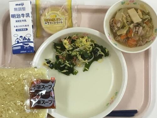 ひやしちゅうか(ちゅうかめん やしちゅうかのぐ スープ) 牛乳 ぶたにくときゃべつのみそいため レモンタルト