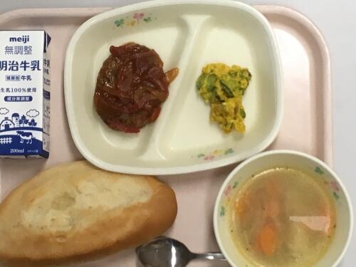 シュガーパン ☆牛乳 ハンバーグなつやさいがけ かぼちゃサラダ コンソメスープ