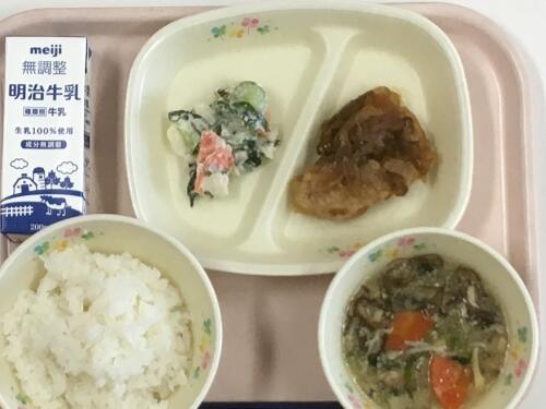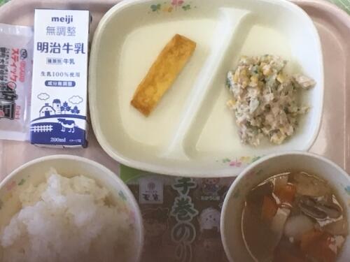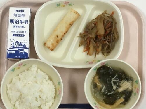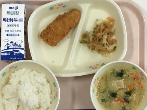 ごはん 牛乳 さけフライ ソース ちゅうかくらげあえ こうやどうふとたまごのスープ