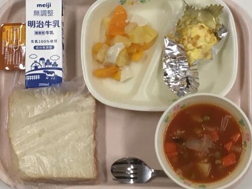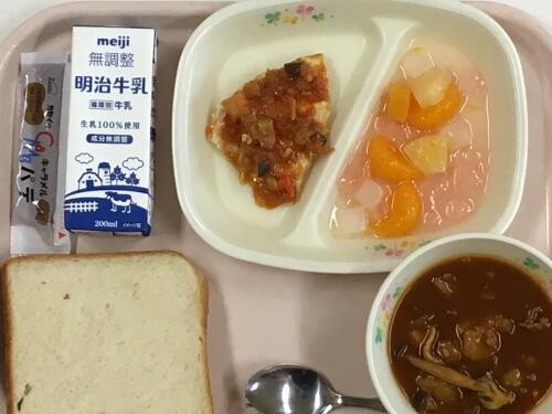 ☆食パン ☆はちみつマーガリン ☆牛乳 ☆ポークビーンズ ◇☆さかなのコーンチーズやき フルーツとうにゅうかん〔☆・・乳 ◇・・卵 □・・ナッツ類 ◎・・エビ・カニ類〕
