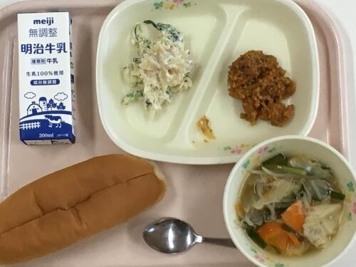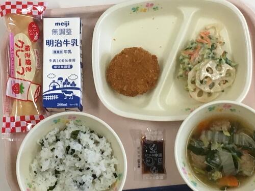 わかめごはん 牛乳 はるさめスープ あさのメンチ(ソース) レンコンサラダ いちごクレープ