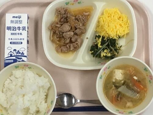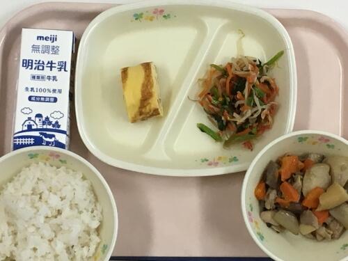 麦ごはん 牛乳 あつやきたまご こまつなのさくらエビあえ ちくぜんに