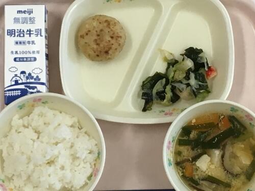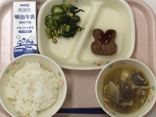 ごはん 牛乳 おつきみハンバーグケチャップソースかけ えだまめサラダ とんじる