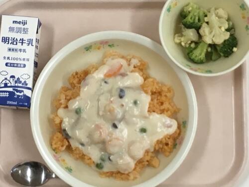 ドリアふうチキンピラフ(チキンピラフ ドリアふうホワイトソース) 牛乳 ブロッコリーサラダ