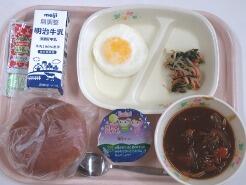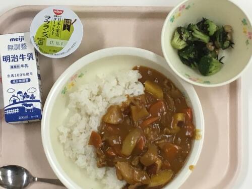 麦ごはん 牛乳 さつまいもカレー ひじきとまめのサラダ ラフランスヨーグルト