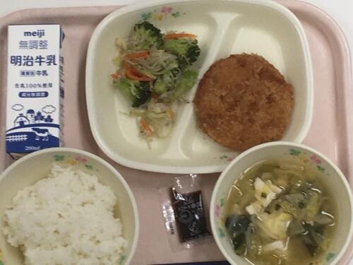 ごはん 牛乳 ハムカツ(ソース) ブロッコリーとじゃこのサラダ はくさいのみそしる