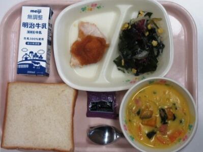 食パン ブルーベリージャム 牛乳 かいそうサラダ とりのバーベキューソースかけ パンプキンシチュー