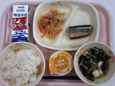 くりごはん(ごましお) 牛乳 さんまのしおやき わかめととうふのみそしる あきさめサラダ なしゼリー
