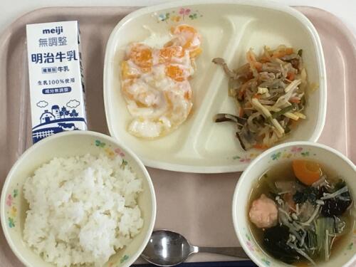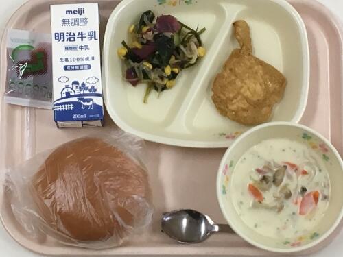 ☆とちぎけんさんこむぎ食パン とちおとめジャム ☆牛乳 ☆タンドリーチキン かいそうサラダ ◇☆クラムチャウダー〔☆・・乳 ◇・・卵 □・・ナッツ類 ◎・・エビ・カニ類〕