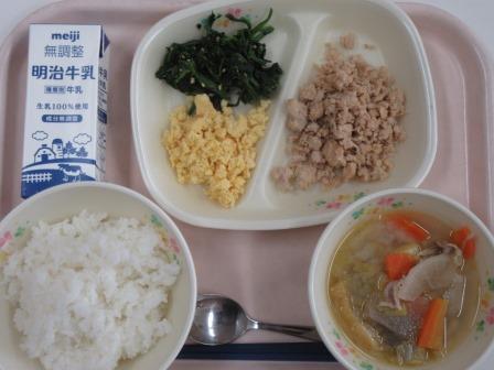 セルフさんしょくどん(ごはん とりそぼろ ◇いりたまご おひたし) ☆牛乳 とうにゅうじたてのやさいじる〔☆・・乳 ◇・・卵 □・・ナッツ類 ◎・・エビ・カニ類〕
