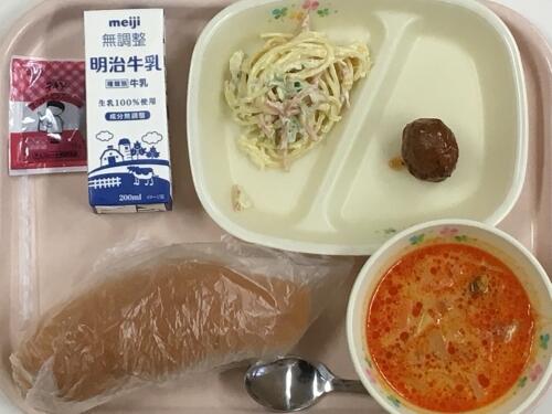 ☆コッペパン ☆チョコ ☆牛乳 にくだんご ◇☆スパゲティサラダ ☆トマトクリームシチュー〔☆・・乳 ◇・・卵 □・・ナッツ類 ◎・・エビ・カニ類〕