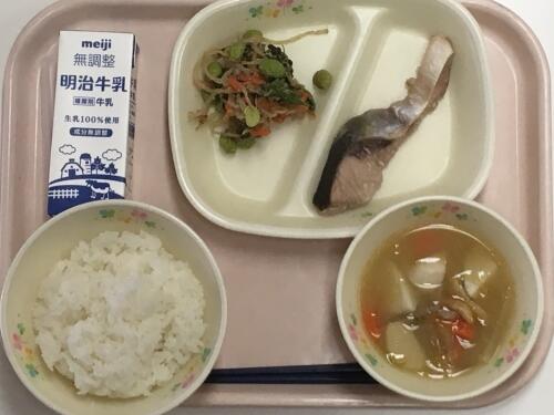 ごはん ☆牛乳 ぶりのてりやき まめあえ さといもじる〔☆・・乳 ◇・・卵 □・・ナッツ類 ◎・・エビ・カニ類〕