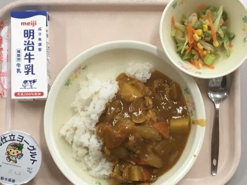 麦ごはん 牛乳 ポークカレー アスパラサラダ とちぎけんさんヨーグルト