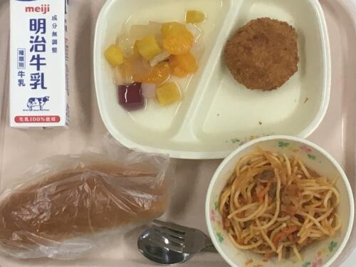 ミニはちみつパン 牛乳 チーズいりコロッケ ツナとトマトのスパゲティ あじさいポンチ