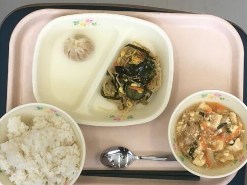 ごはん,牛乳,にらまんじゅう,中華クラゲあえ,マーボーはるさめ