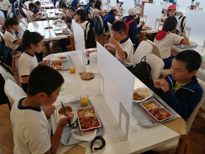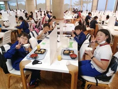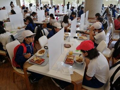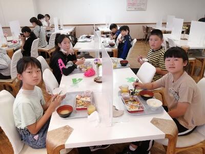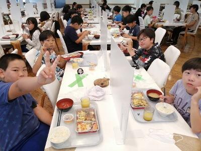 昼食です。コロナ対策でお弁当形式ですが、モリモリ食べています。