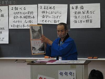 4年生が喜連川について調べ、それを学校で発表するにあたり、「伝える極意を学ぶ」目的で、本日、観光案内ボランティアの方にお越しいただきお話をいただきました。実は、先日、テレビ局の取材を受け、喜連川の歴史などをお話ししたということで、どうすれば相手に伝わるか、お話しするときのポイントを教えていただきました。
