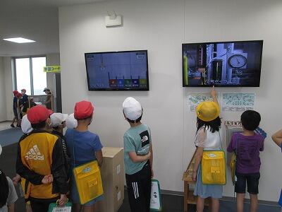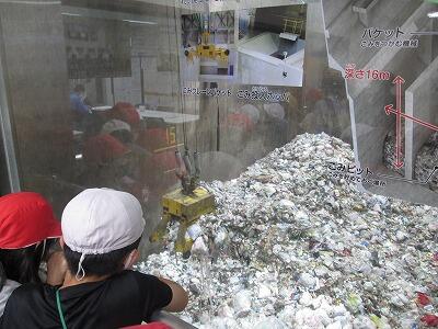 エコパークでは、ゴミの処理についてビデオやクイズで学んだり、ゲームなどでゴミの分別などを学びました。また、3階の見学スペースから、ゴミが運ばれたり、分別されたり、大型クレーンでゴミを移動させたりする様子を見ました。