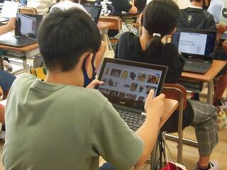一つ目は、5年生の外国語の授業です。「発表カードをつくろう」というめあてで行われていました。5年生では書く活動も入っています。今回は、クロームブックを使って発表作りをしていました。