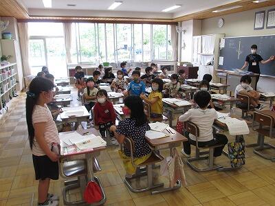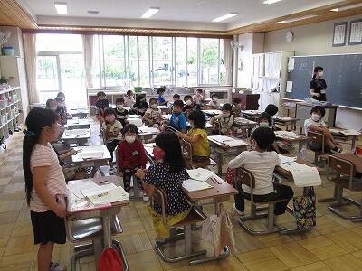 2年生の様子です。国語の学習である子が発表をしていました。そして学級の多くの子が発表するこの意見をしっかり聞こうと体ごとその子に向いて聞いていました。「うんうん」とうなづいている子、真剣な目で聞いている子など、とても一生懸命な様子が伝わってきました。
