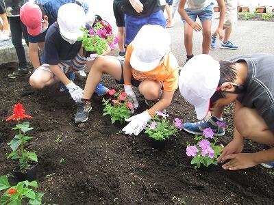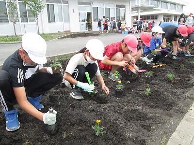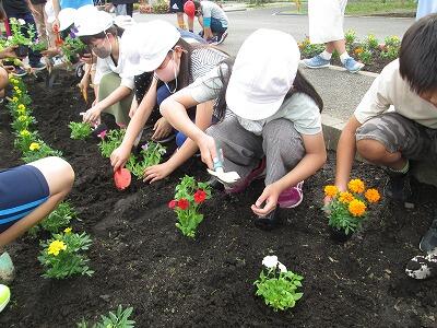 今週、子どもたちが、学年ごとに校舎前の花壇やプランターに花の苗を植えました。先日いただいた人権の花のマリーゴールドの他、ペチュニアやサルビア、ブルーサルビアなどの苗を、子どもたちが一つ一つ手で植えました。ぐんぐん育って、花いっぱいの学校になることを願っています。