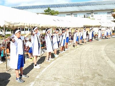 雨のため、1日延期となった運動会ですが、本日、青空の下、実施することができました。今年度のスローガンは「1年に一度の大舞台 一致団結 栄光つかめ」でした。このスローガンのとおり、演技、競技はもちろん、応援も一致団結してがんばっていました。お越しいただいた皆様には、子どもたちの「きらきら輝く」姿をご覧いただくことができたのではないかと思います。
