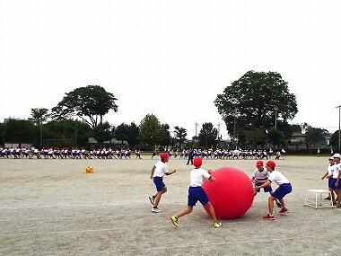 1、2年生の団体競技「大玉ころがし」です。自分たちと同じくらいの大きさの大玉ですが、力を合わせて転がしました。