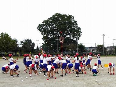3時間目は、5、6年生が団体競技「定番種目全部やっちゃおう!」の練習をしていました。最初に、綱引きと大玉送りを行います。次に、その結果をもとにスタート時間を変えて、玉入れを行います。勝敗は、玉入れの結果で決まるそうです。