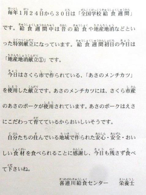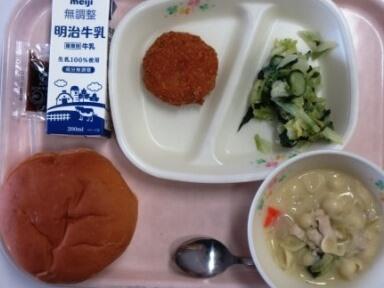 ☆丸パン ☆牛乳 ◇☆あさのメンチカツ(ソース) グリーンサラダ ◇☆マカロニとはくさいのクリームに〔☆・・乳 ◇・・卵 □・・ナッツ類 ◎・・エビ・カニ類〕