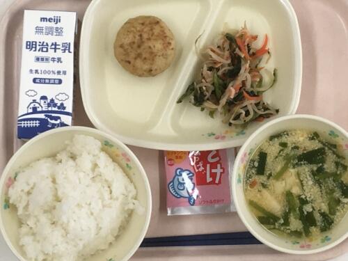 ごはん ふりかけ ☆牛乳 わふうきんぴらつつみやき ◎こまつなのさくらエビあえ ◇にらいりかきたまじる〔☆・・乳 ◇・・卵 □・・ナッツ類 ◎・・エビ・カニ類〕
