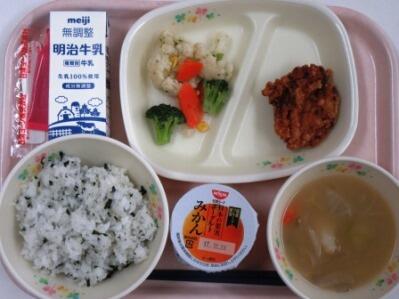 わかめごはん ☆牛乳 ミルメーク(いちご) からあげ ☆ブロッコリーサラダ すいとんじる ☆みかんヨーグルト〔☆・・乳 ◇・・卵 □・・ナッツ類 ◎・・エビ・カニ類〕