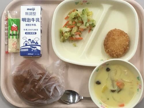 ☆丸パン ◎えびカツ ◇タルタルソース ☆牛乳 きゃべつサラダ ☆さつまいもとくりのシチュー〔☆・・乳 ◇・・卵 □・・ナッツ類 ◎・・エビ・カニ類〕
