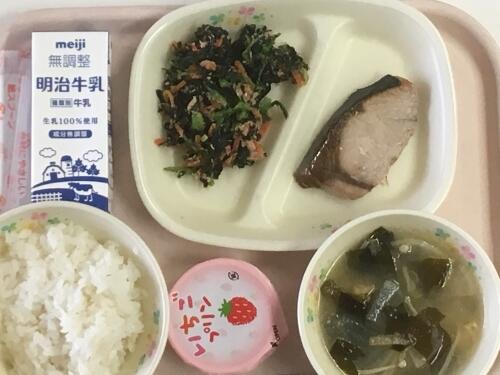 ごはん ☆牛乳 ぶりのちゅうかふうみやき ツナのりずあえ だいこんとあぶらあげのみそしる ☆いちごプリン〔☆・・乳 ◇・・卵 □・・ナッツ類 ◎・・エビ・カニ類〕