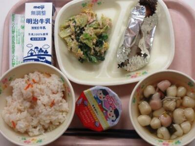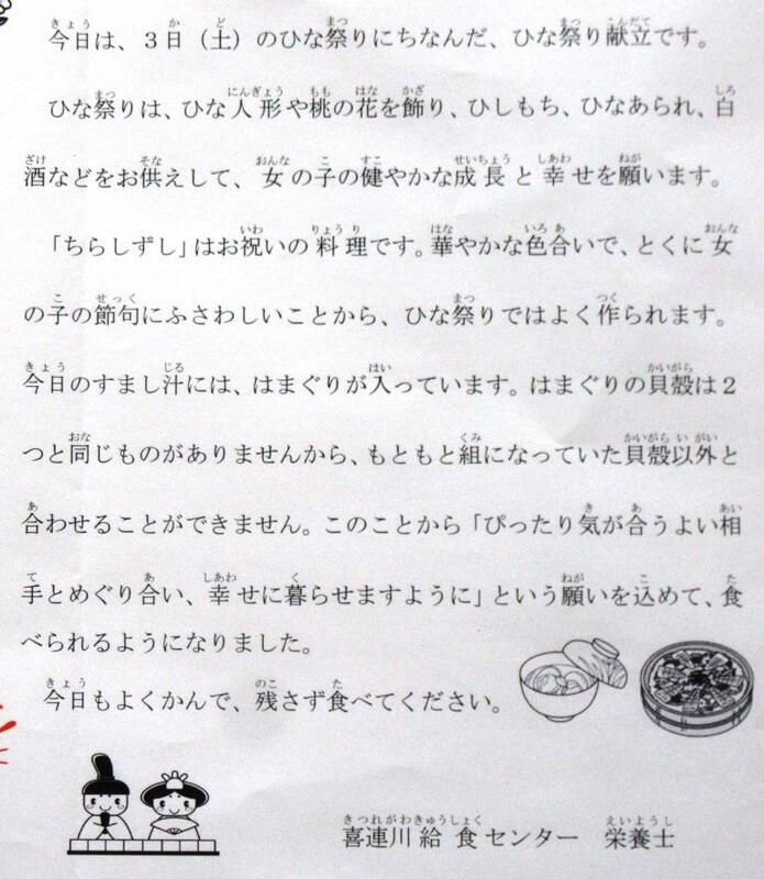 ちらしずし ☆牛乳 たらのさいきょうやき ◇なのはなとツナのあえもの すましじる ひなまつりゼリー(もも)〔☆・・乳 ◇・・卵 □・・ナッツ類 ◎・・エビ・カニ類〕