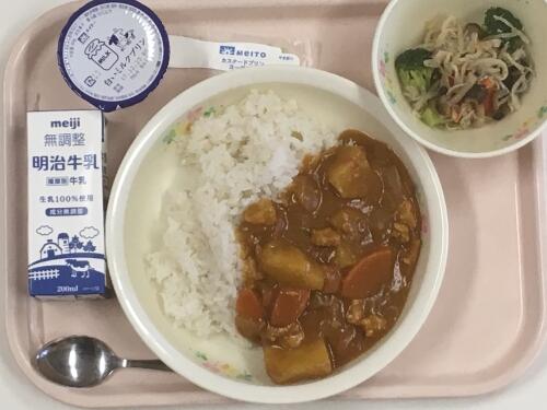 麦ごはん ☆牛乳 ☆チキンカレー じゃこいりわふうサラダ ☆ミルクプリン〔☆・・乳 ◇・・卵 □・・ナッツ類 ◎・・エビ・カニ類〕