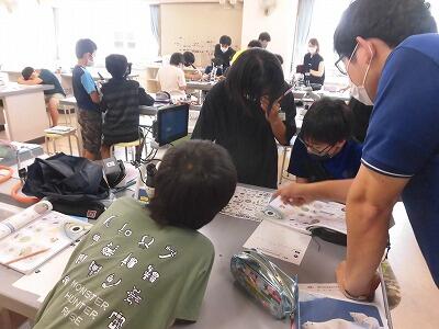 6年生の理科の学習で、電子顕微鏡を使って微生物の観察を行っていました。プレパラートをつくり、顕微鏡でピントを合わせます。プレパラートの中で動いている微生物を見付け、真剣に観察していました。