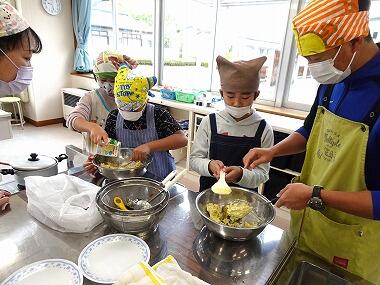 今日、4、5、6、7組の児童が、スイートポテトを作りに挑戦しました。材料のさつまいもは、今年教材園で育ててきたものです。さつまいもの皮むきから卵黄を塗って焼くまで、友達と協力したり、分担したりしながら仲よく作っていました。できあがったスイートポテトを試食させてもらいましたが、甘くてとてもおいしかったです。