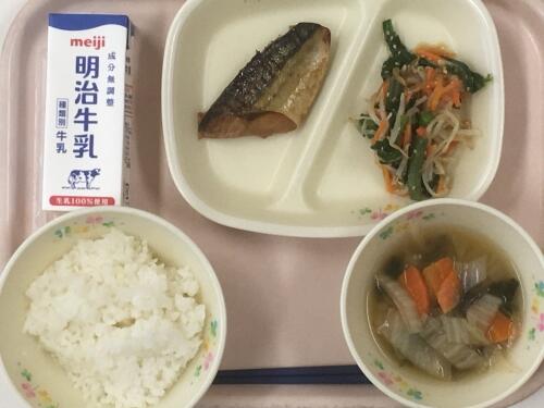 ごはん 牛乳 さばのてりやき にらのわふうあえ あさのポークのにくだんごスープ