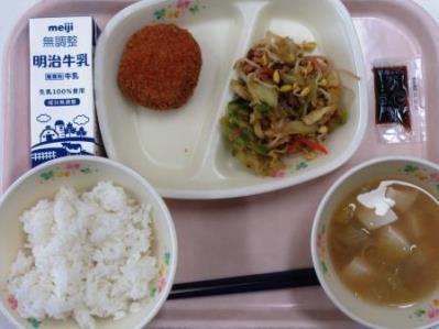 ごはん ☆牛乳 さばのみそに または メンチカツ・ソース □くるみあえ はくさいのみそしる〔☆・・乳 ◇・・卵 □・・ナッツ類 ◎・・エビ・カニ類〕