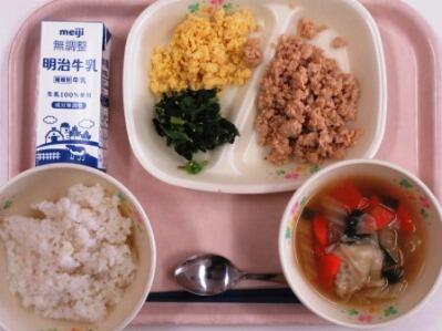 セルフさんしょくどん(麦ごはん とりそぼろ ◇いりたまご おひたし) ☆牛乳 ◇ワンタンスープ 〔☆・・乳 ◇・・卵 □・・ナッツ類 ◎・・エビ・カニ類〕