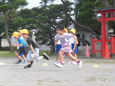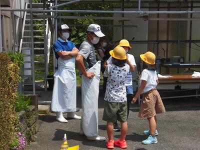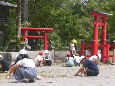 1年生が手に何かをもって外へ行くので、不思議に思いのぞいてみました。すると、物干し台に的がかかっています。手に持っていたのは、子どもたちが生活科の時間に作ってきた水鉄砲でした。しかもペットボトルやケチャップの入れ物に飾りをつけた、オリジナル水鉄砲です。子どもたちは、水をたくさん入れて、的に向かって水鉄砲を発射させていました。みんな笑顔で、暑さに負けず夏と戯れていました。
