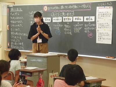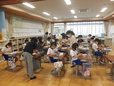 本校では今年度、「自ら学び、豊かに表現する児童の育成~「書く」活動を通して~」をテーマに研究に取り組んでいます。また、県の人権教育研究校に指定され、道徳科を中心に人権尊重の精神を育む教育に取り組んでいます。今日は、1年生、3年生、5年生で研究授業を行いました。