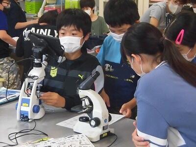 6年生の理科の学習で、電子顕微鏡を使って微生物の観察を行っていました。プレパラートをつくり、顕微鏡でピントを合わせます。プレパラートの中で動いている微生物を見付け、真剣に観察していました。