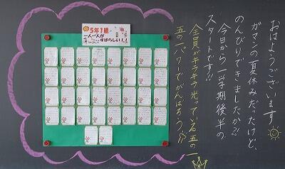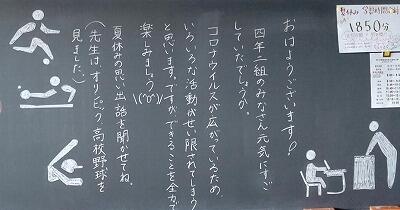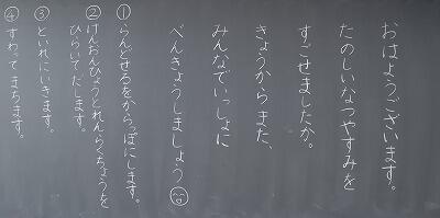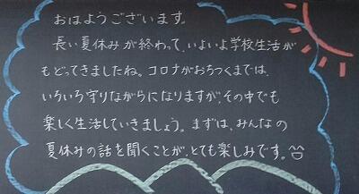 40日間の夏休みが終わりました。新型コロナウイルス感染症の大流行で暗くなりがちですが、子どもたちが安全・安心で、「がんばるぞ」というやる気や元気を持ってほしいことから、先生方は黒板に思いを込めて子どもたちを迎えていました。