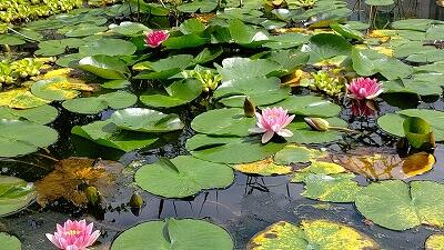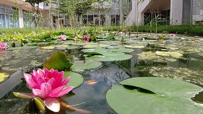 中庭の池に、蓮の花が鮮やかに咲き続けています。暖かな気候の中で、蓮の花の赤い色が神秘的に輝いています。
