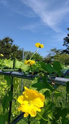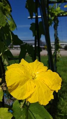 校庭の南にある学校の畑に、4・5年生が育てているヘチマがあります。いま、そのヘチマに黄色い花が咲き、畑を彩っています。青空を背景に咲き誇る黄色い花は、より大きく見え、「新型コロナウイルスに負けないぞ」と言っているような感じがします。