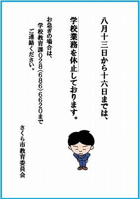 年度はじめにお便りでお知らせしましたとおり、8月13日から16日までのお盆の期間は、学校業務を休止します。特に8月13日(金)と16日(月)は平日ですが、学校に職員は出勤しておりません。あらかじめご承知おきくださいますようお願いいたします。なお、13日・16日、急なご用の場合は、さくら市学校教育課(028-686-6620)までご連絡ください。