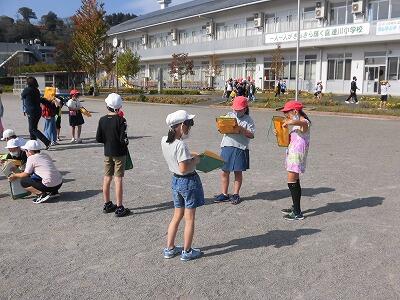 おや、3年生も校庭に出てきました。何をするのか聞いてみると、かげの勉強をするようです。グループで協力して、長いかげを作ります。いろいろ話し合いながら、どのグループのかげが長いかを競い合っていました。晴れてよかった!