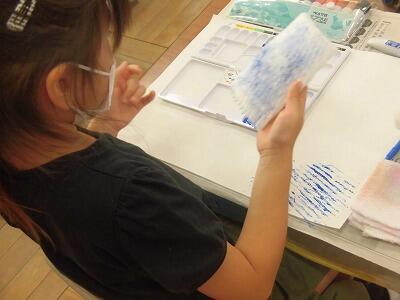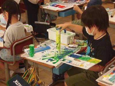 「わー、青と黄色を混ぜたら緑ができた!」「先生、もう塗っていいですか?」