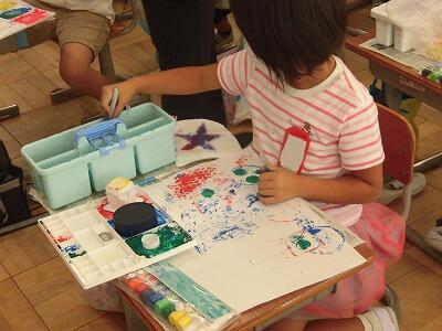 1年生が教室で真剣な表情で絵の具の作業をしています。めあてを見ると「ペッタンコロコロして、かたちをたのしもう」とあります。机の上には、自宅から持ってきたたくさんの道具。それに絵の具をつけて、ぺったんとはんこのように押したり、コロコロ転がしたりして、いろいろな形を作っていきます。みんな芸術家のように、集中して取り組んでいました。